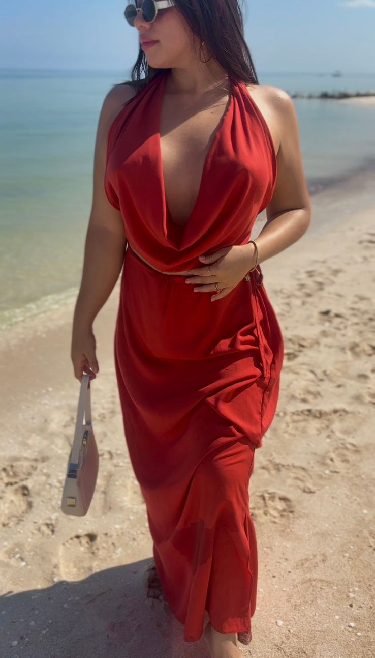 Un top con cowl neck ajustable gracias a sus cintas, junto a nuestra versión de la falda inspirada en LAILA: con cintas en la cintura y aberturas laterales que te dan libertad y elegancia en cada paso. 💫