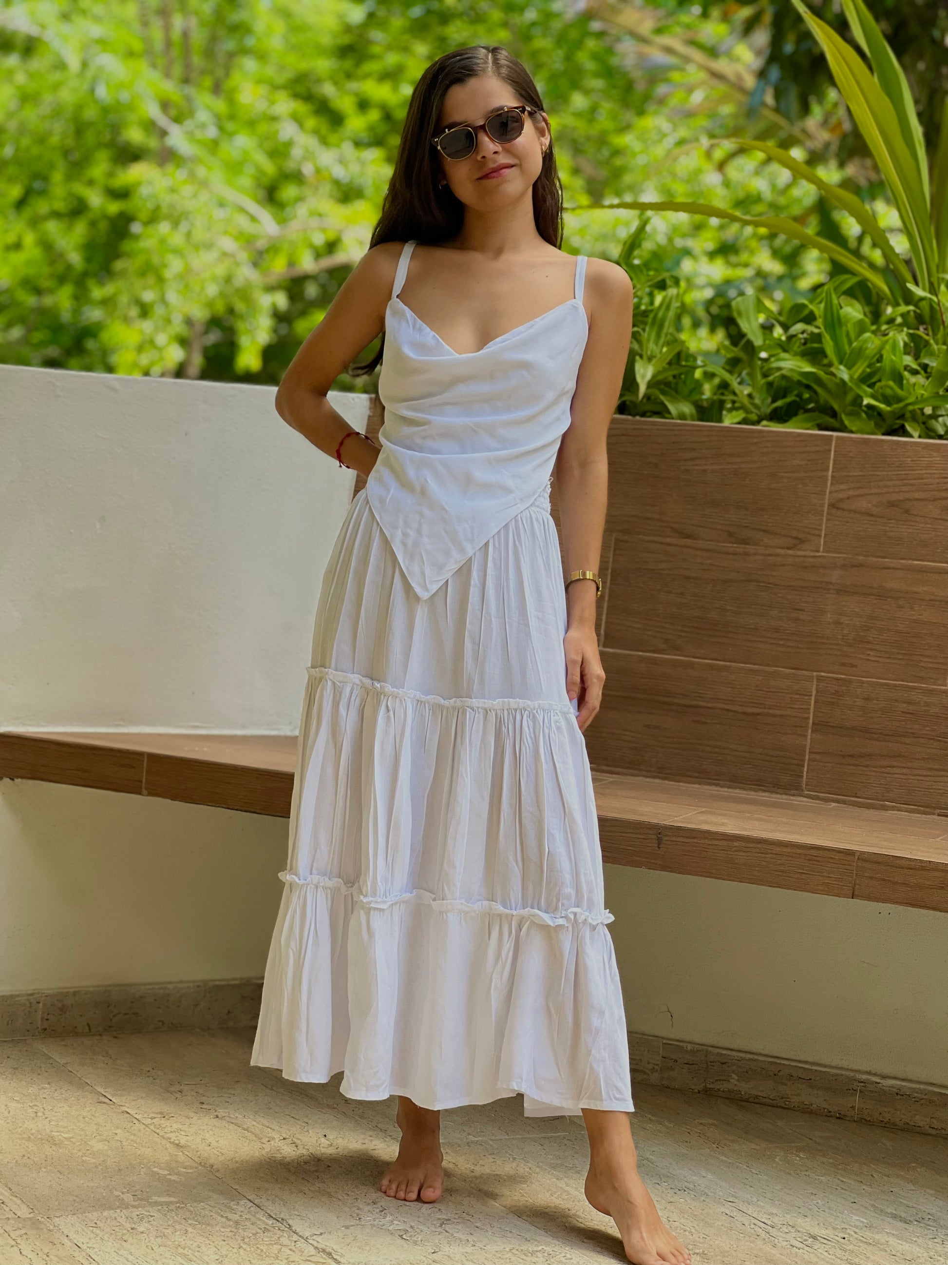 Set de falda y top versátil: falda de tres tiempos con cintura elástica que se adapta suavemente a tu silueta, combinada con un top de cuatro cintas que te permite crear distintos tipos de escote y estilos según la ocasión.